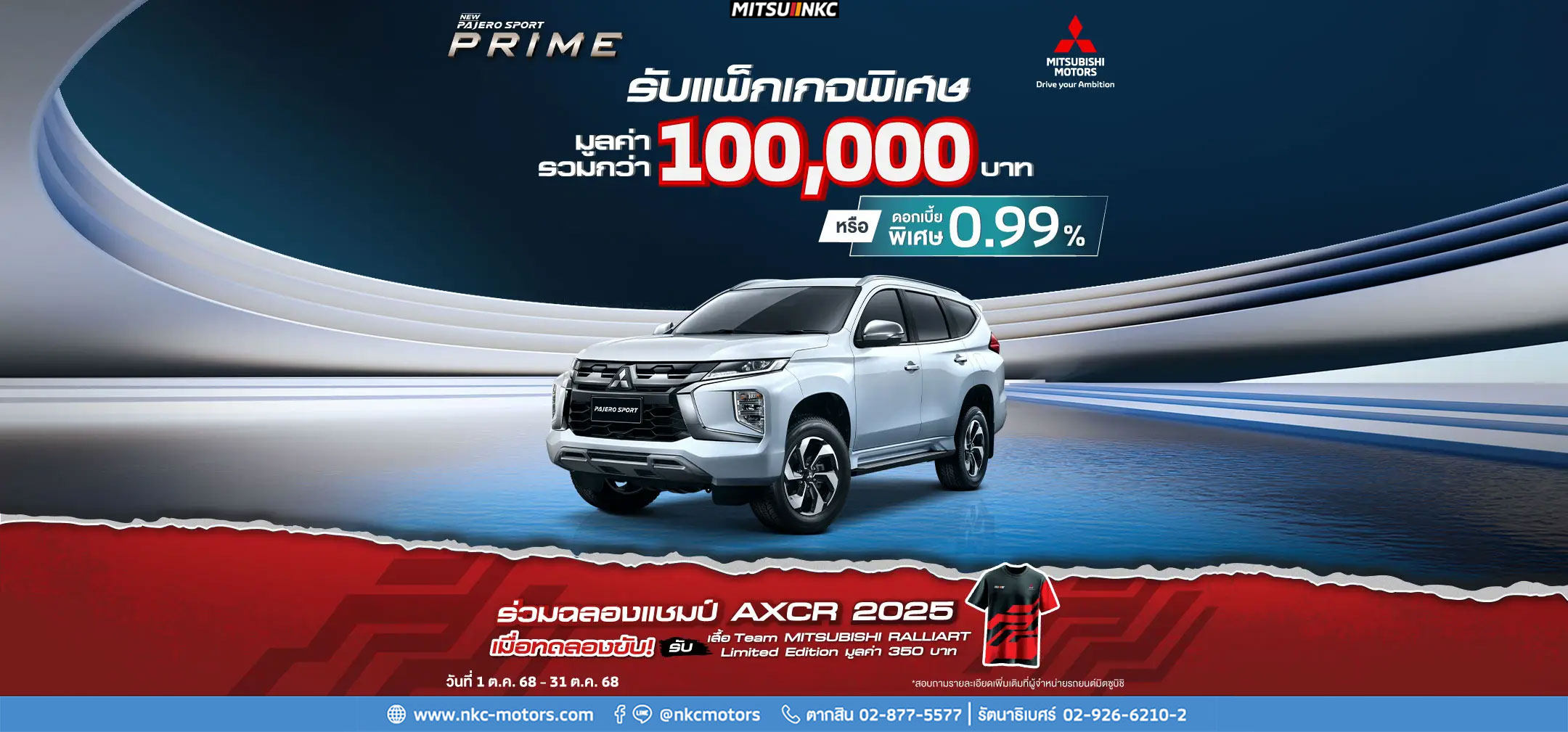 ซื้อ New Pajero Sport Elite Edition หรือ New Pajero Sport เลือกรับส่วนลดพิเศษพร้อมประกันภัยชั้น 1 มูลค่ารวมกว่า 100,000 บาท หรือรับดอกเบี้ยพิเศษ 0.99% นาน 48 เดือน