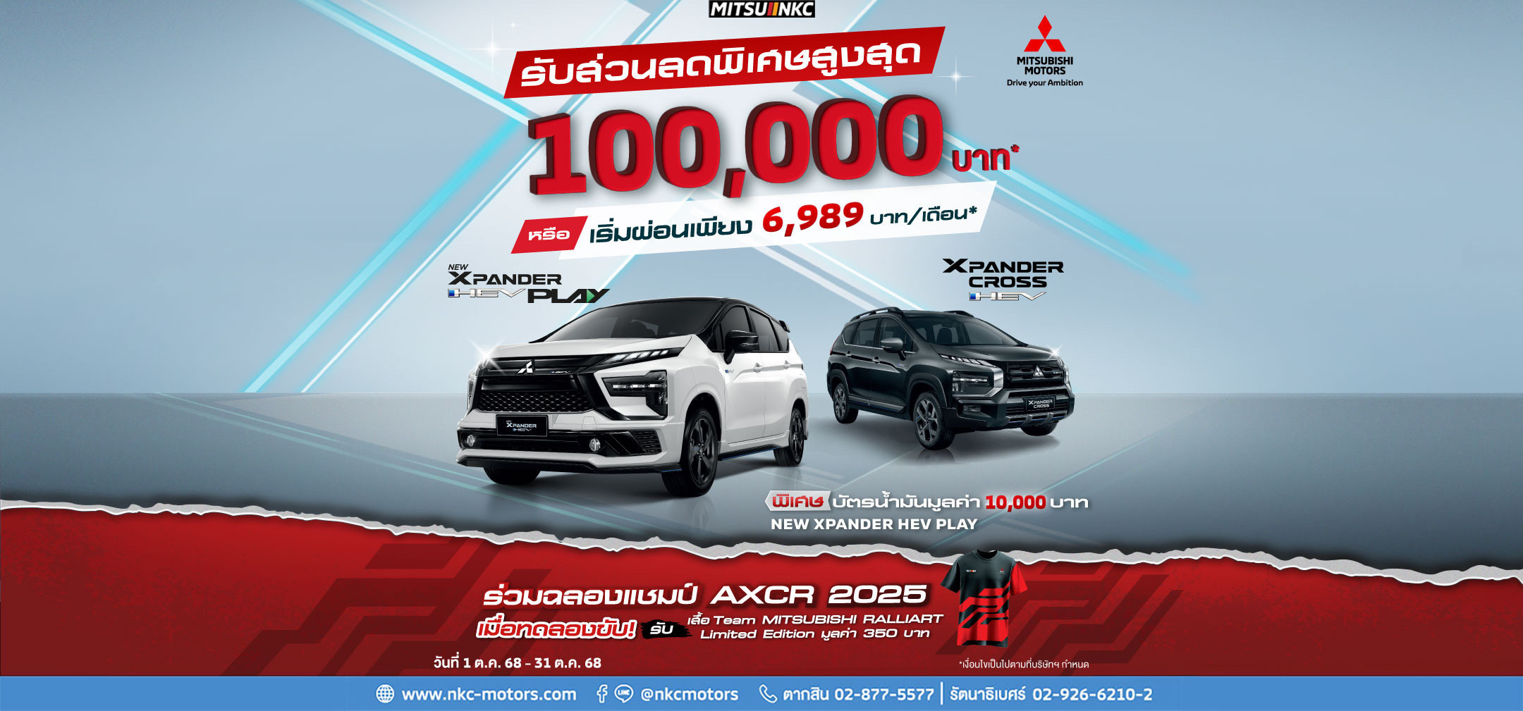ลูกค้า Xpander HEV, Xpander Cross HEV, New Xpander HEV PLAY และ New Xpander Cross HEV PLAYเลือกรับส่วนลดพิเศษสูงสุด 100,000 บาท หรือ ผ่อนต่ำเพียง 6,989 บาท